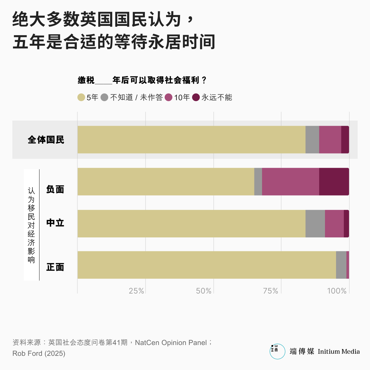 过去的社会调查就早已显示,即使问的是“社会福利”而非“居留权”,也只有约3%的极少数民众认为,在英国工作、缴税的移民“永远”不能取得和英国公民一样的社会福利──也就是说,法拉吉的政策提案支持率很可能只有3%。相反地,压倒性多数(84%)都认为五年以内甚至更短的时间就该足够。事实上,就连对移民态度负面的民众,也有三分之二的绝大多数认为五年的等待期已经足够长。