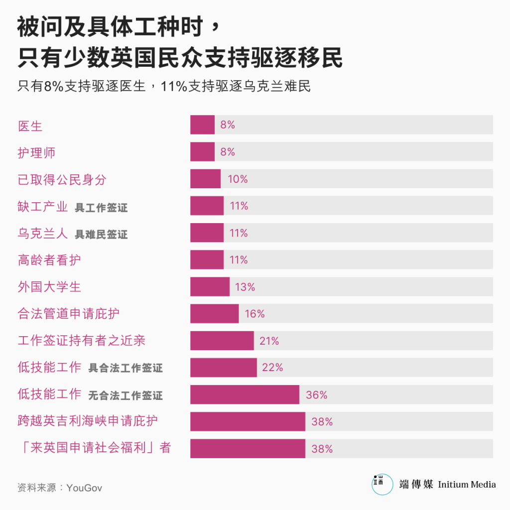 今年上半年民调机构YouGov的调查也呈现出类似的图像:只有极少数人、约10%的民众认为需要驱离外国学生、高龄者看护、水管工、护理师、医生。事实上,就连回答支持“大幅要求现有移民离境”的民众中,通常也只有20%至30%认为需要驱离这些工种的工人。这项调查并未特别询问民众对移英港人的意见,但针对“乌克兰难民”,只有11%的极少数民众认为需要减少移民数量,甚至连认为需要大规模驱离移民的民众当中,也只有27%认同要缩减。
