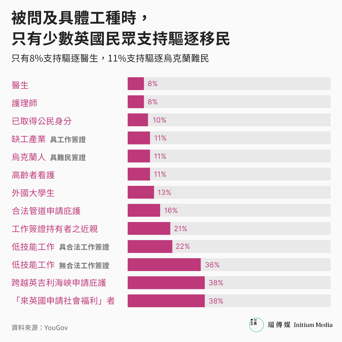 今年上半年民調機構YouGov的調查也呈現出類似的圖像:只有極少數人、約10%的民眾認為需要驅離外國學生、高齡者看護、水管工、護理師、醫生。事實上,就連回答支持「大幅要求現有移民離境」的民眾中,通常也只有20%至30%認為需要驅離這些工種的工人。這項調查並未特別詢問民眾對移英港人的意見,但針對「烏克蘭難民」,只有11%的極少數民眾認為需要減少移民數量,甚至連認為需要大規模驅離移民的民眾當中,也只有27%認同要縮減。