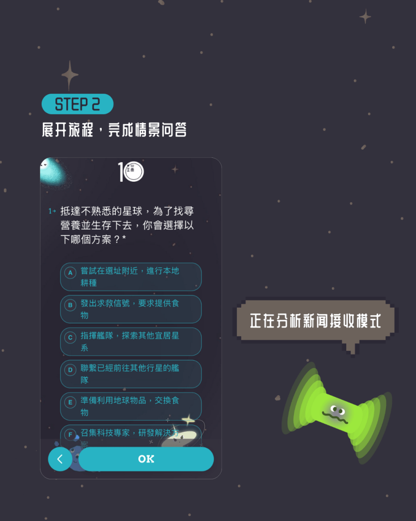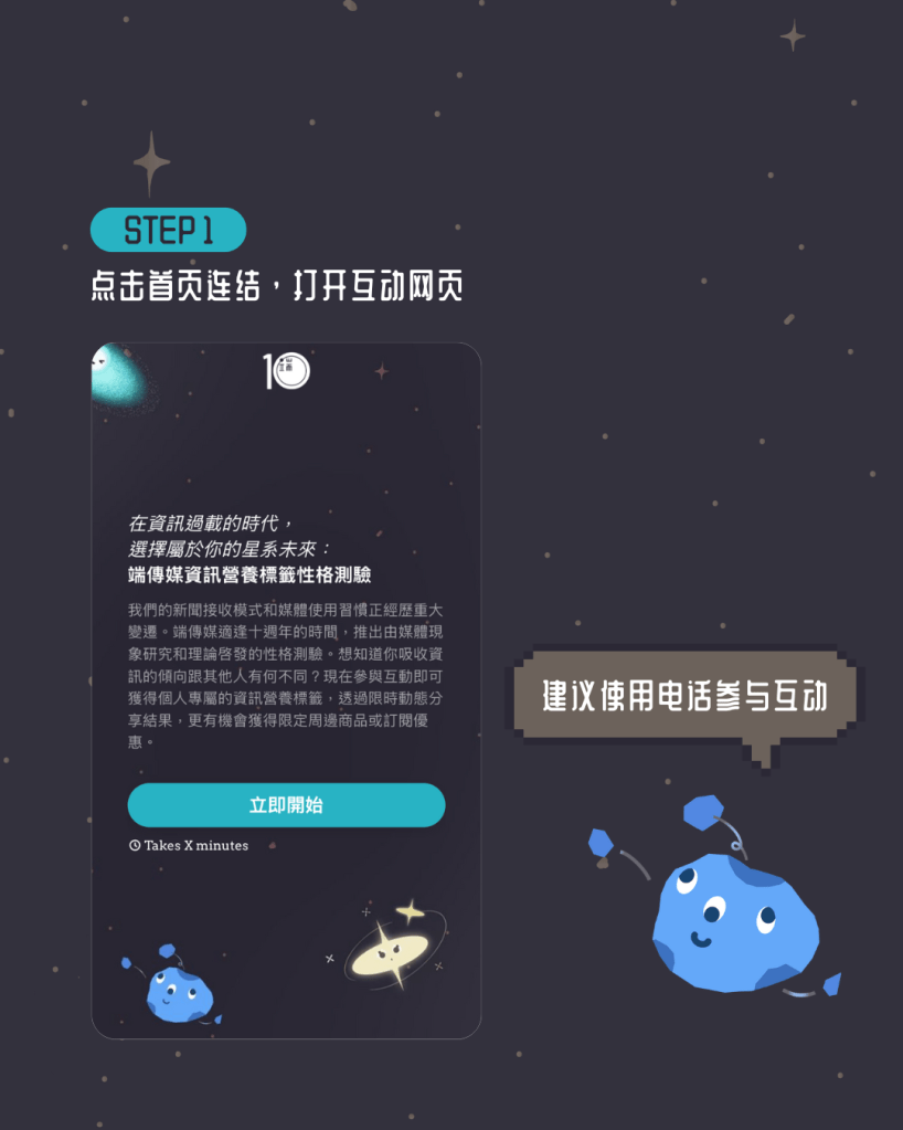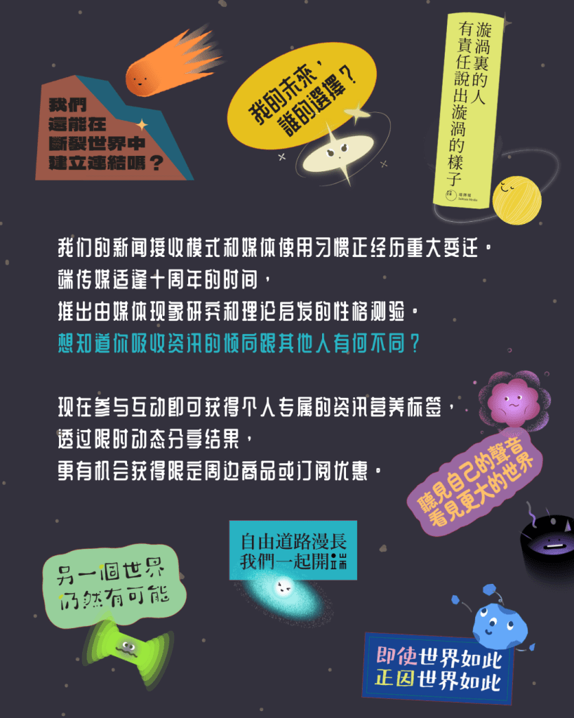 透过情景问答,你将会进入一个被资讯过载和演算法支配下,进入扁平时代的未来。当所有话题变得单一乏味,你跟朋友决意出发,重建久违的多元世界。我们偏好不同议题的形式、接触内容的方式以及支持媒体的模式,跟大家经常讨论的注意力碎片化、过滤气泡、末日刷屏以至回音室效应现象之间会否有意想不到的连结?性格测验尝试分析你的新闻接收模式,你更可以透过限时动态分享分析结果并跟身边人比较各自的媒体使用习惯,同时有机会获得限定周边商品或订阅优惠。