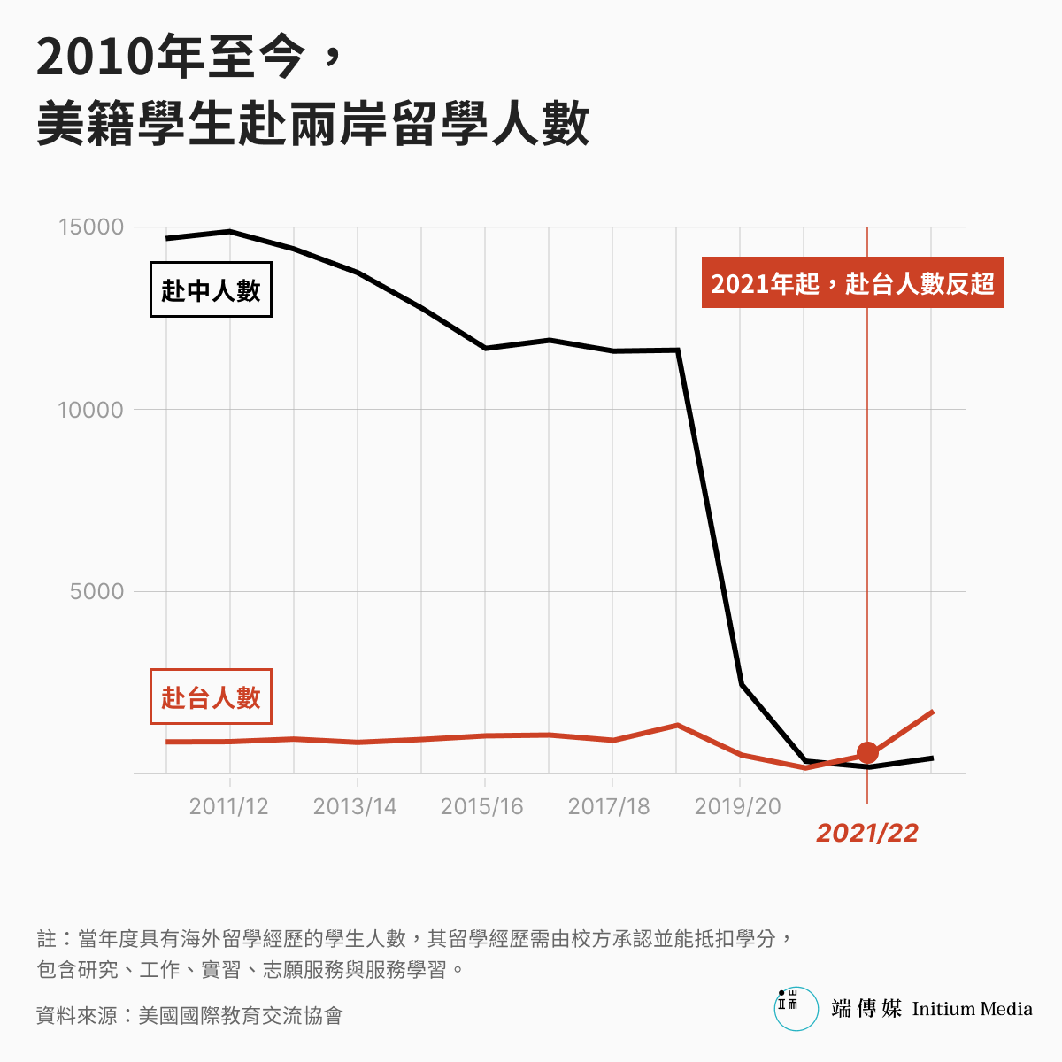 捷西之所以改道台灣,正是受到美中變局的影響。自八零年代在冷戰尾聲時尼克森訪中之後,美中關係持續加溫,到了2008年北京奧運時以一曲《北京歡迎你》敞開大門,「中國熱」達到最高點。2011年有近1萬5千名美國學生赴中留學。直到疫情肆虐、國境封鎖,美中關係也猶如斷崖式分手,到了2021年,僅存兩百多名美籍留學生赴中。