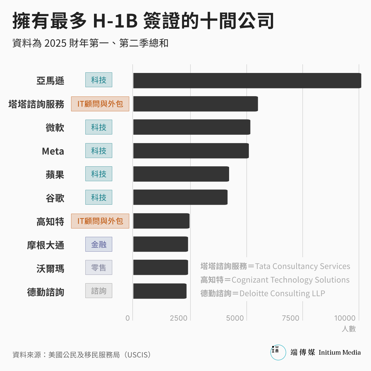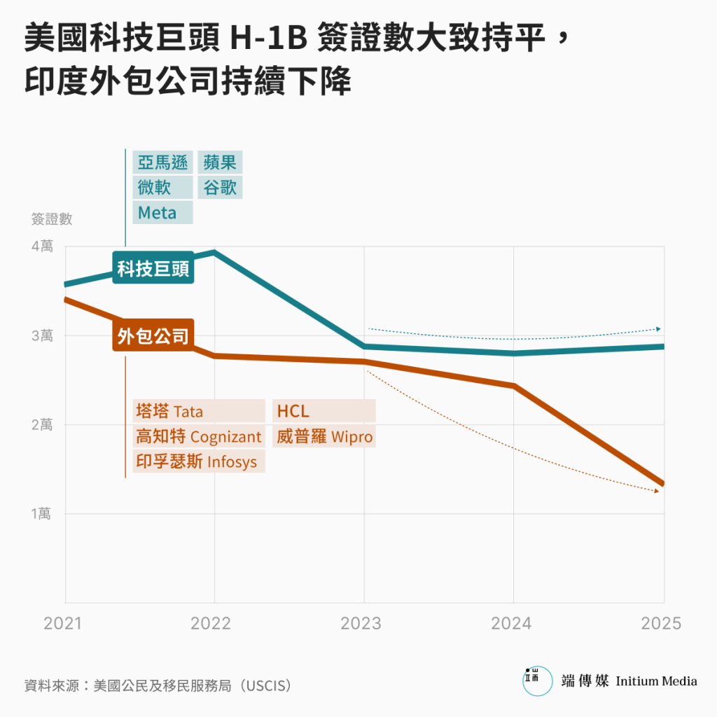 對比五大科技巨頭與五大外包公司獲得的 H-1B 簽證數量可見,新制度上路後確實對外包公司產生明顯影響。印度外包企業獲得的簽證數量從2024財年的約2.4萬張,大幅下滑至2025財年的約1.3萬張。這無疑是科技巨頭樂見的結果。