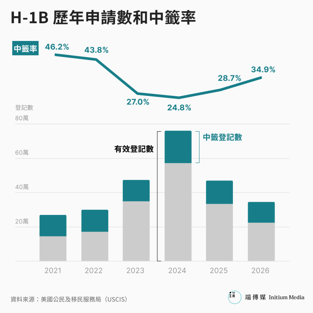2022年以前,H-1B 的中籤率都高於40%。但2023年到2025年,申請人數大幅增加,中籤率下滑至20-30%左右。最新一次抽籤,有效登記數約為34萬人,中籤率近35%,但仍未回到2022年前的水平。