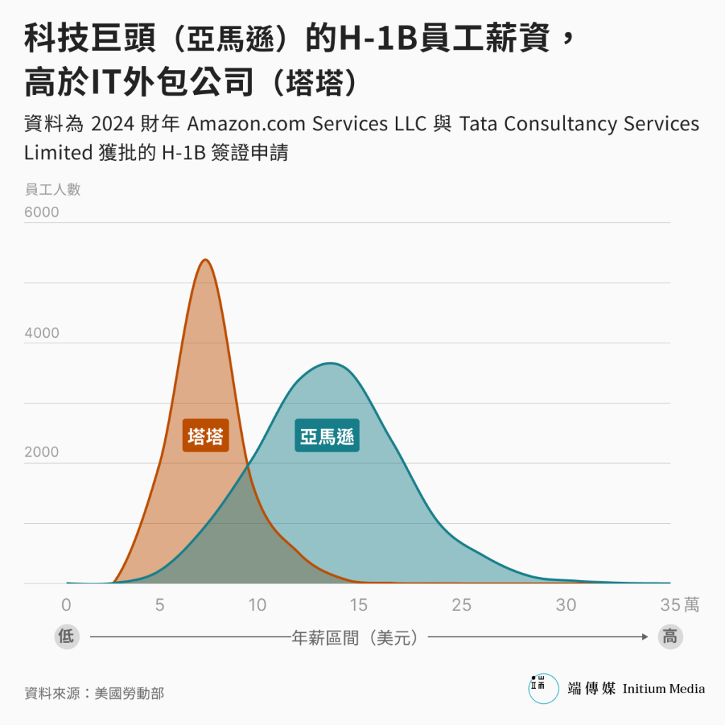 與此同時,外包公司也將受到嚴重打擊。對比2024財年獲得最多H-1B簽證的科技巨頭亞馬遜和外包公司塔塔諮詢服務(Tata Consultancy Services),亞馬遜員工的年薪中位數約為15.3萬美元,塔塔為8.4萬美元。若申請費超過員工一整年的薪水,塔塔和其他外包公司提交大量申請的人海戰術將不再可行。