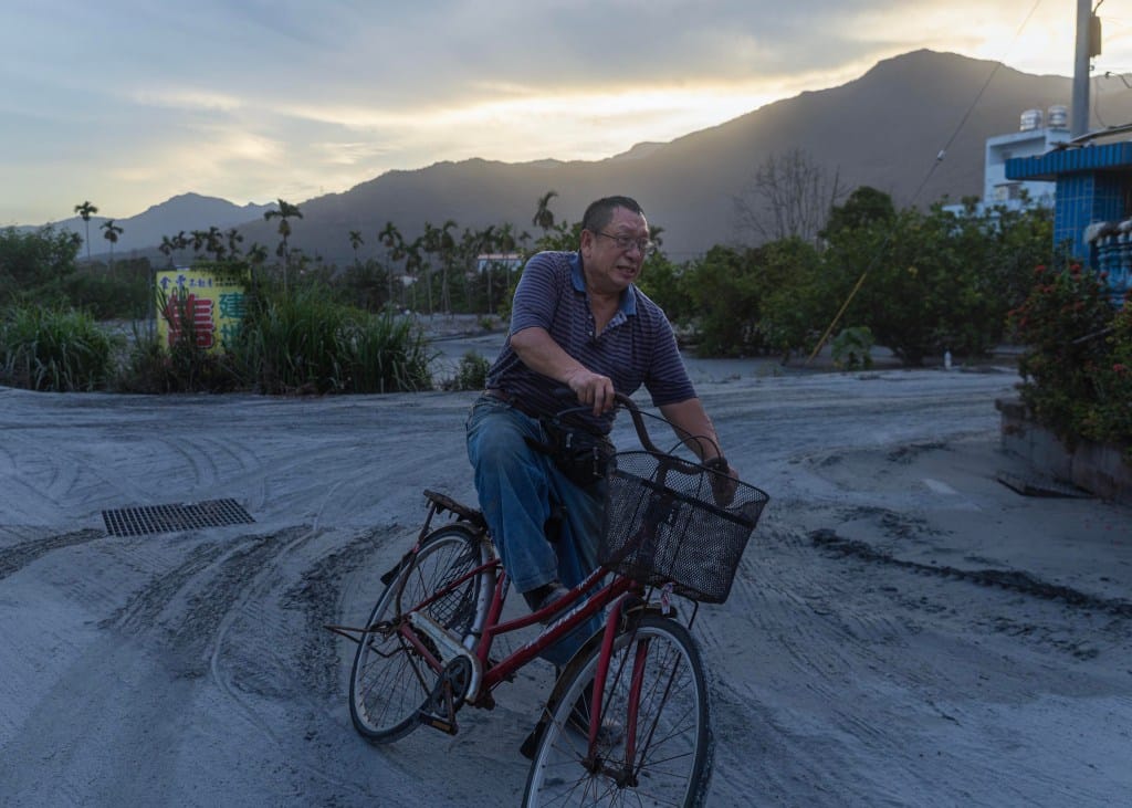 2025年9月26日,花蓮光復鄉,一名居民騎自行車在滿布灰煙的路上行走。攝:陳焯煇/端傳媒