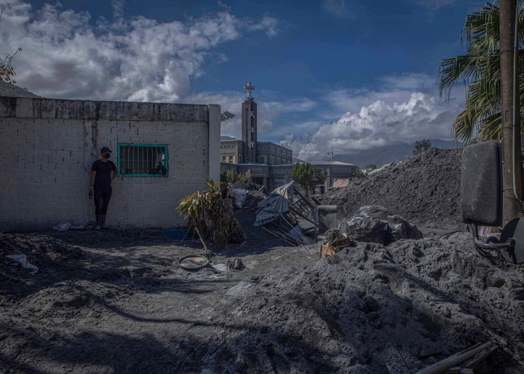 2025年9月30日,花蓮光復鄉,一間教堂外,堆積了清理出來的淤泥。攝:陳焯煇/端傳媒