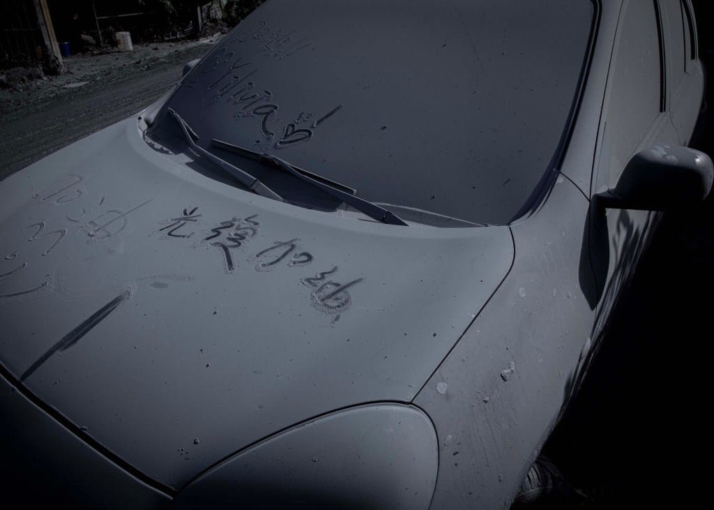 2025年9月30日,花蓮光復鄉,道路上一架布滿塵土的汽車,人們寫上「光復加油」。攝:陳焯煇/端傳媒