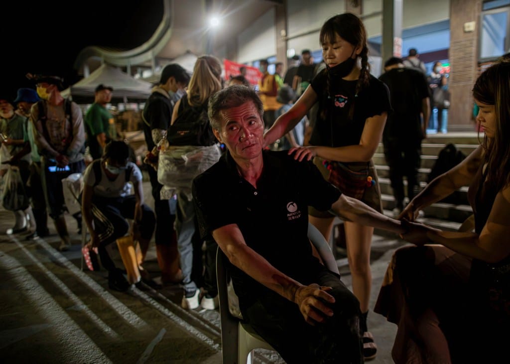 2025年9月30日,花蓮光復鄉,有志工在車站外替民眾按摩。攝:陳焯煇/端傳媒