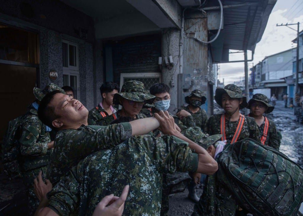 2025年10月1日,花蓮光復鄉,一名國軍協助居民清理後,身體不適。攝:陳焯煇/端傳媒