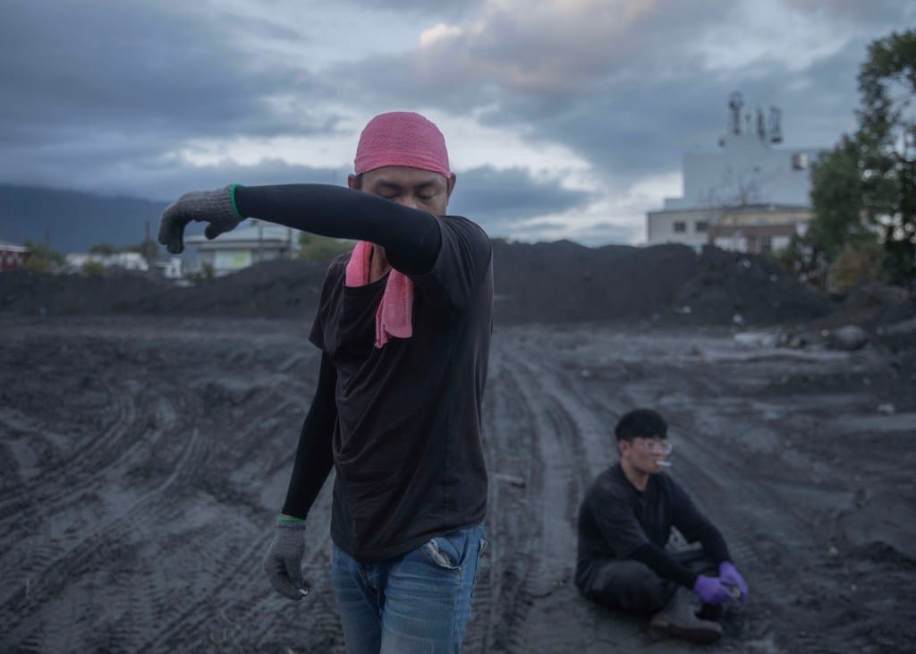 2025年10月1日,花蓮光復鄉,志工在協助清理期間休息。攝:陳焯煇/端傳媒