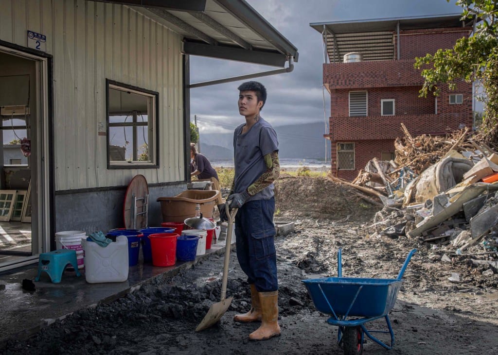 2025年9月29日,花蓮光復鄉阿陶莫部落,一名年青人清理自己的家園。攝:陳焯煇/端傳媒