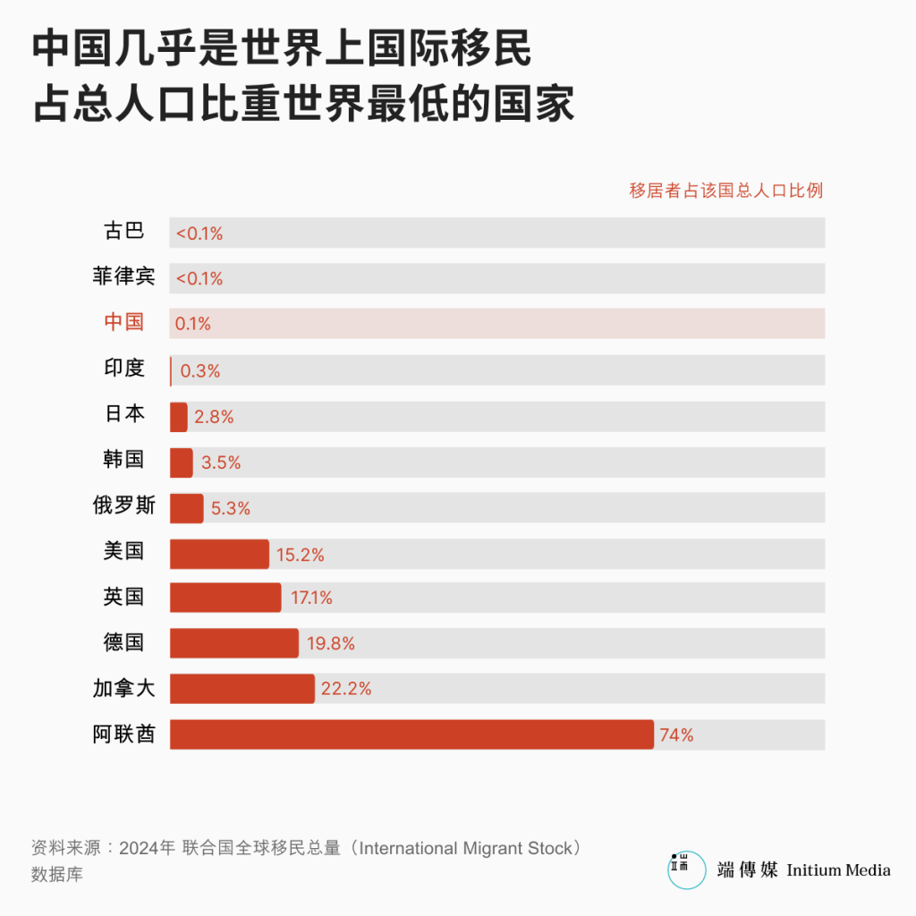 而与这些以引进移民为竞争力的国家相比,中国的外籍人口比例极低。2024年,联合国估算,外国居民仅占中国总人口的0.1%,远低于东亚平均值0.7%,在全球排名倒数第三——仅高于古巴与菲律宾。