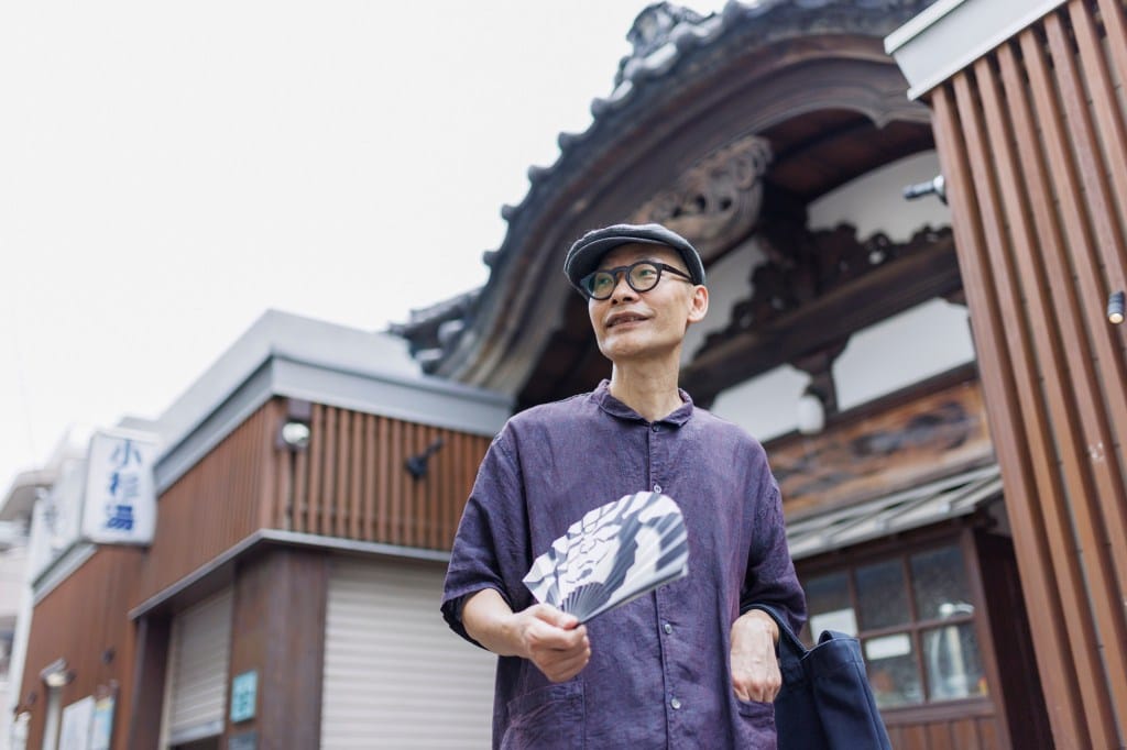 穿過純情商店街,拉麵燒肉立食,也有雜貨古著店,街道切割區域,橫側直走,離開主要商店街,很快便鑽進人跡稀落的民居一帶。遠遠看到「小杉湯」招牌,直至轉到正門,才看到整個錢湯建築全貌。烈日下的散策,李照興輕提小布袋,單手搖着紙扇,像個說書人,娓娓道來錢湯復興運動的故事,遠處看去,又似一個剛好從隔壁過來的居民,悠悠然,準備來錢湯浸浴。