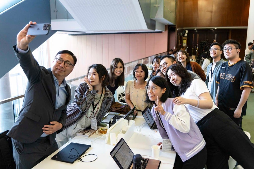 2025年10月15日,立法會會議,狄志遠到記者工作區找一眾記者合照,神情輕鬆。攝:鄧家烜/端傳媒